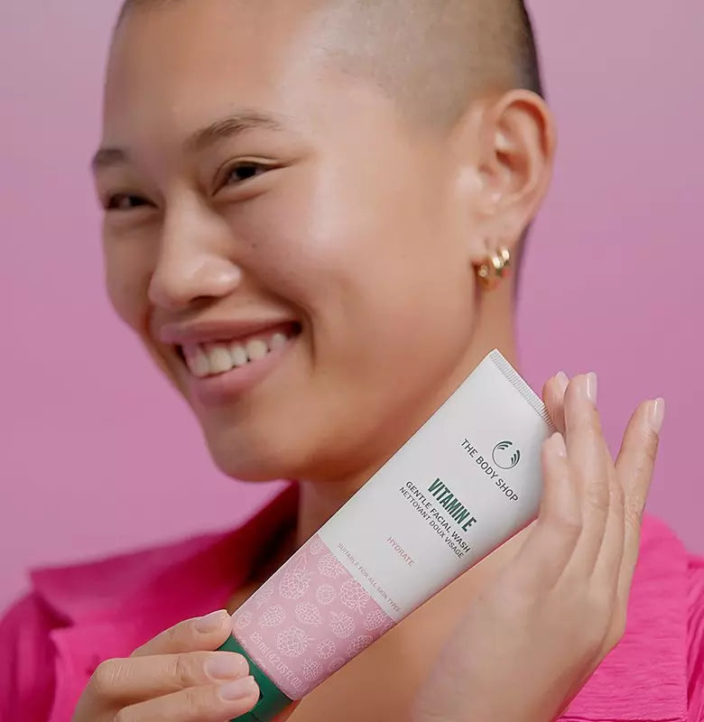 Begin met onze Vitamin E Gentle Face Wash. Deze zachte reiniger helpt dagelijkse vuil en onzuiverheden van je huid te verwijderen en zorgt voor een frisse basis voor de rest van je verzorgingsroutine – zonder je huid uit te drogen!